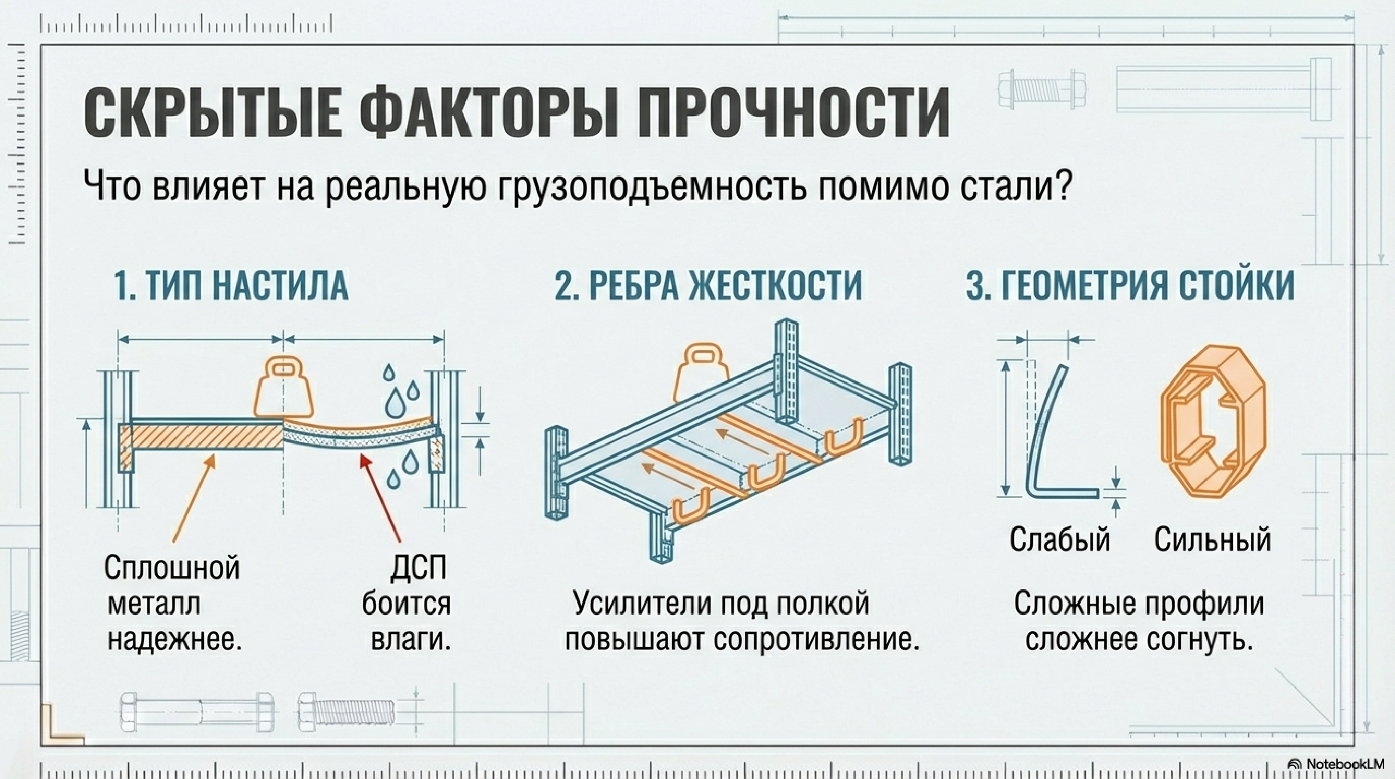 Ребра жесткости: Наличие подгибов или приваренных П-образных профилей под полкой значительно увеличивает её сопротивление на излом.