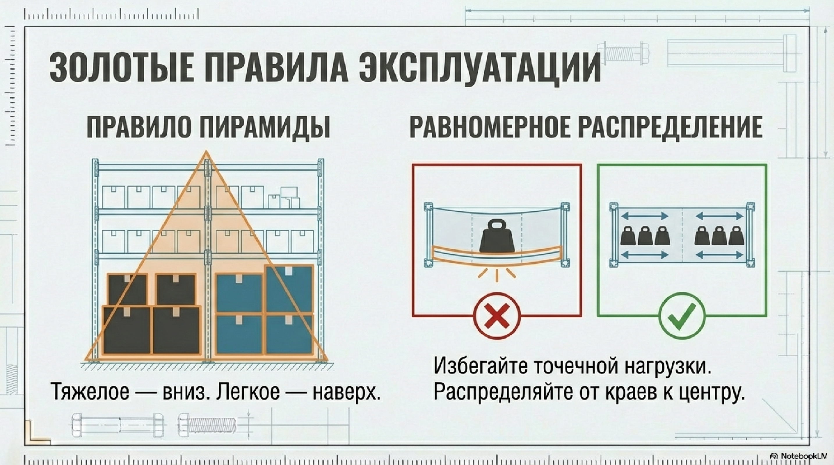 Чтобы стеллаж прослужил заявленный срок (10–15 лет), соблюдайте два правила расстановки: