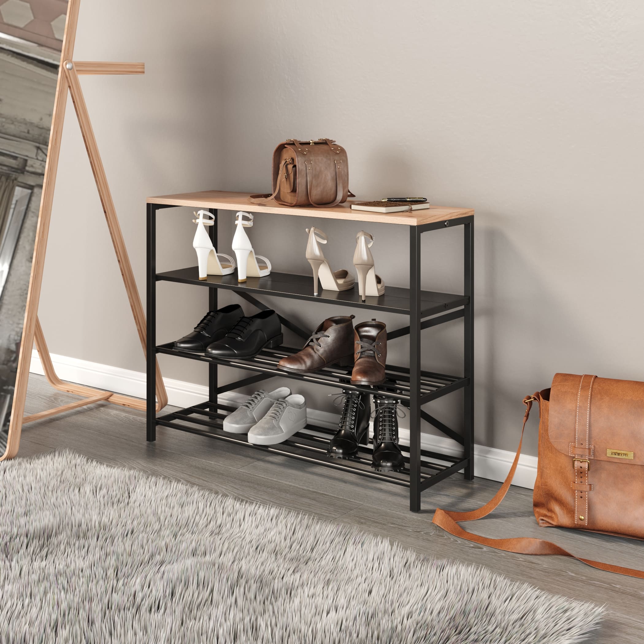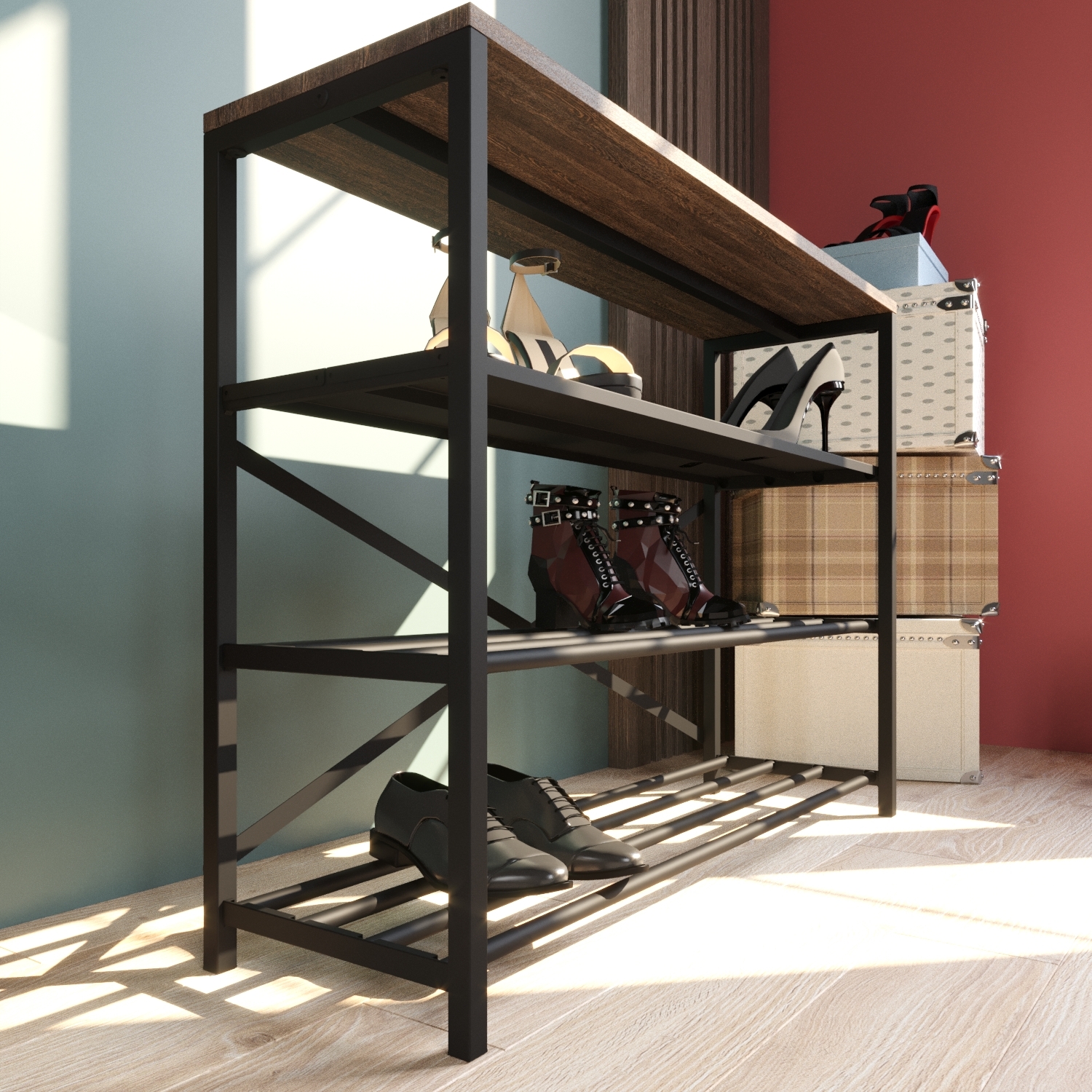 Обувница GUTTA 71х92х29 см, четыре полки — это стильное и функциональное решение для хранения обуви в стиле лофт. Каркас выполнен из качественной конструкционной холоднокатаной стали марки 08пс, что обеспечивает высокую прочность и долговечность изделия. Металлические детали покрыты порошковой краской черного цвета, которая защищает их от коррозии и придает обувнице элегантный внешний вид.