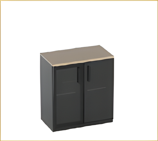 Шкаф малый, с одной полкой и дверьми с окнами, сверху топ. Корпус шкафа выполнен из ЛДСП толщиной 16 мм, топ контрастного цвета из ЛДСП толщиной 25 мм. Двери металлические, с окнами. Полка металлическая. Шкаф устанавливается на металлический цоколь с регулируемыми опорами, можно выровнять изделие на неровном полу. Ручки эргономичные, металлические.