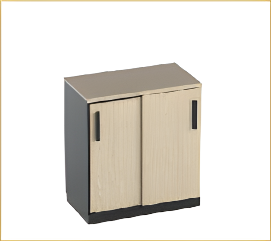 Шкаф малый, с одной полкой и двумя сдвижными дверьми, сверху топ. Корпус шкафа и двери выполнены из ЛДСП толщиной 16 мм, топ из ЛДСП толщиной 25 мм. Полка металлическая. Шкаф устанавливается на металлический цоколь с регулируемыми опорами, можно выровнять изделие на неровном полу. Ручки эргономичные металлические.