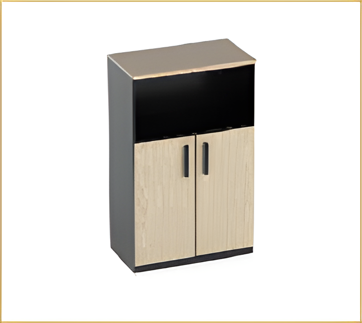 Шкаф средний, с полкой и полкой-разделителем. Двери закрывают только нижнюю полку. Сверху топ. Корпус шкафа, полка-разделитель и двери выполнены из ЛДСП толщиной 16 мм, топ из ЛДСП толщиной 25 мм. Полка металлическая. Шкаф устанавливается на металлический цоколь с регулируемыми опорами, можно выровнять изделие на неровном полу. Ручки эргономичные, металлические.