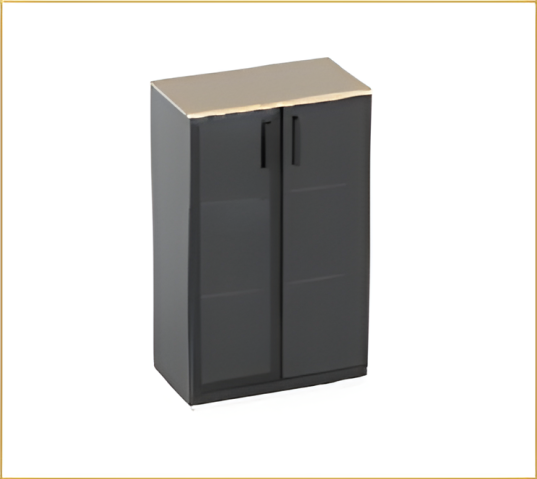 Шкаф средний, с двумя полками и дверьми с окнами, сверху топ. Корпус шкафа выполнен из ЛДСП толщиной 16 мм, топ контрастного цвета из ЛДСП толщиной 25 мм. Двери металлические, с окнами. Полки металлические. Шкаф устанавливается на металлический цоколь с регулируемыми опорами, можно выровнять изделие на неровном полу. Ручки эргономичные, металлические.