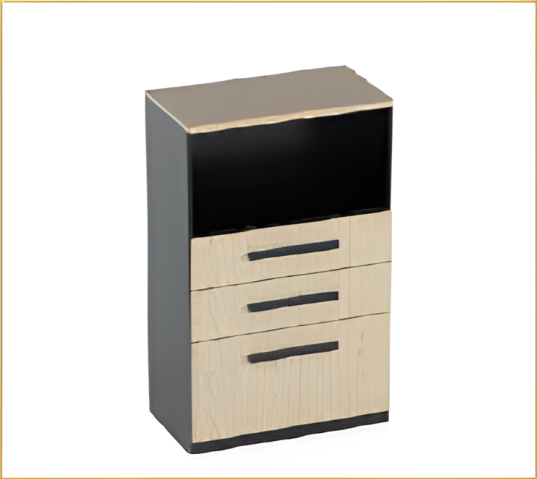 Шкаф средний, с тремя выдвижными ящиками, сверху топ. Корпус шкафа и фасады ящиков выполнены из ЛДСП толщиной 16 мм, топ из ЛДСП толщиной 25 мм. Корпуса ящиков сварные, металлические. Шкаф устанавливается на металлический цоколь с регулируемыми опорами, можно выровнять изделие на неровном полу. Ручки эргономичные металлические.