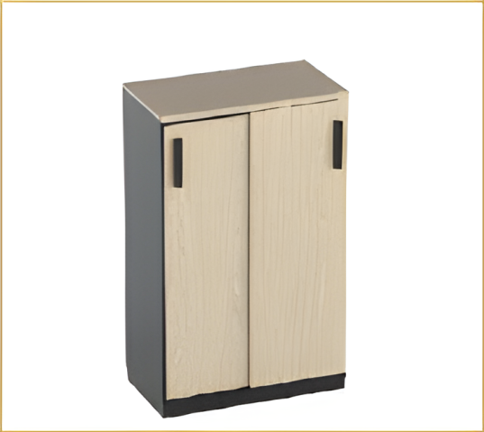 Шкаф средний, со сдвижными дверьми и двумя полками, сверху топ. Корпус шкафа и двери выполнены из ЛДСП толщиной 16 мм, топ из ЛДСП толщиной 25 мм. Полки металлические. Шкаф устанавливается на металлический цоколь с регулируемыми опорами, можно выровнять изделие на неровном полу. Ручки эргономичные, металлические.