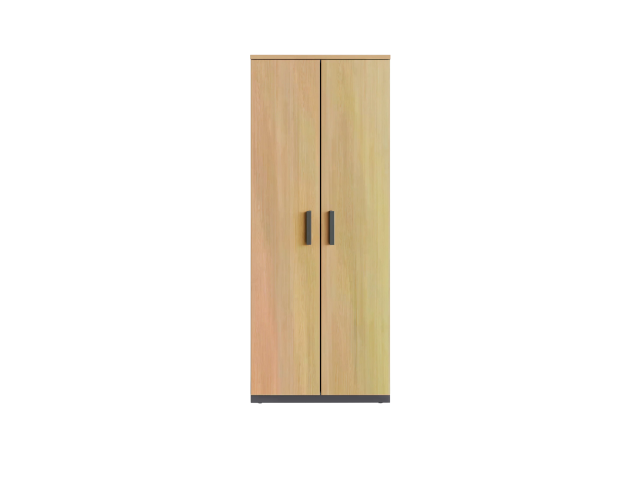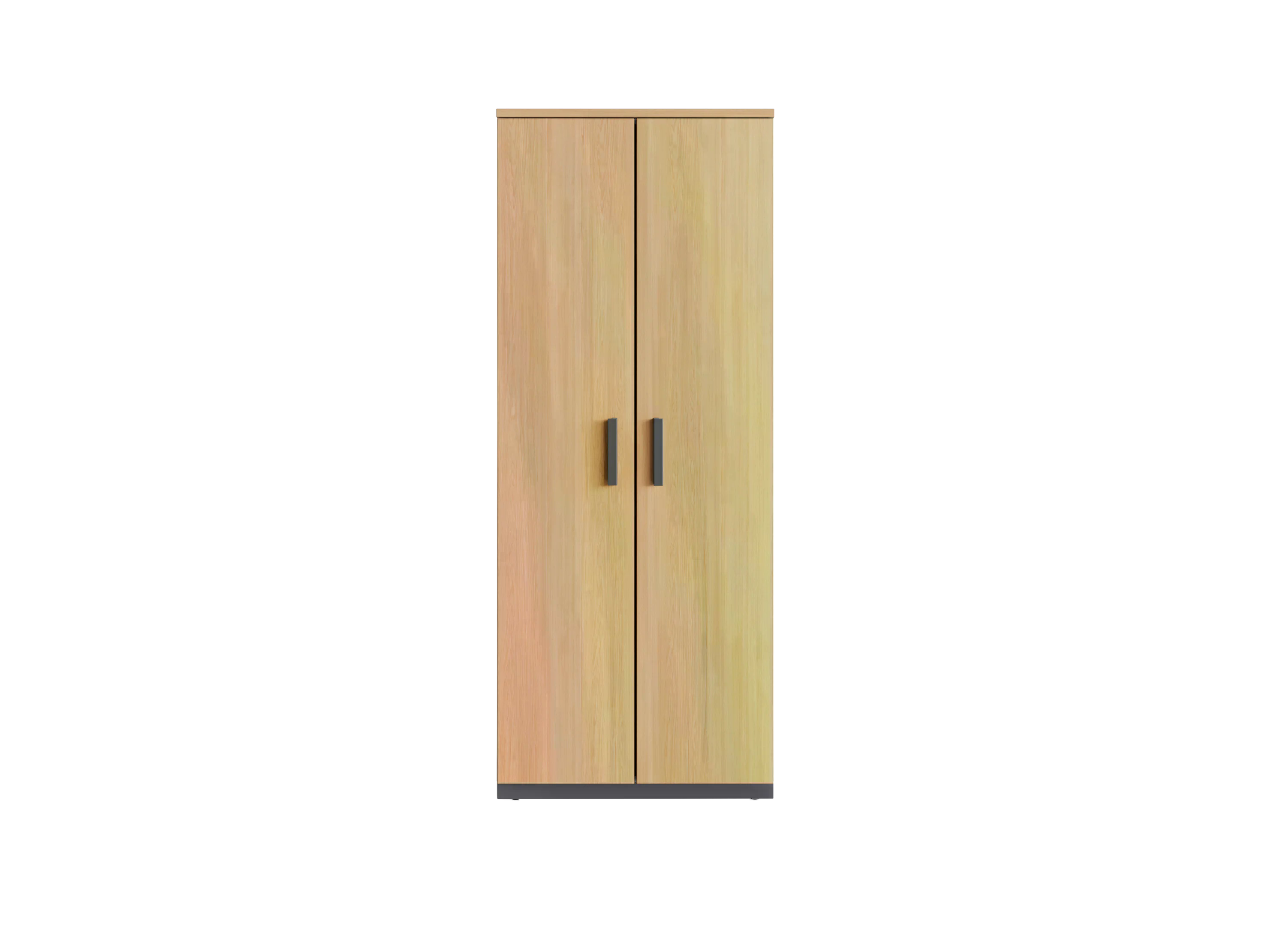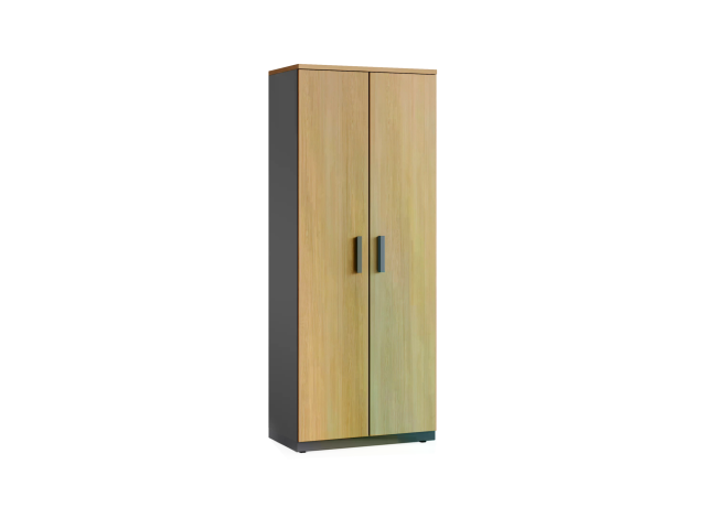 Шкаф гардеробный, распашной, с двумя дверьми. Внутри полка верхняя с перекладиной и крючками, полка нижняя под обувь, сверху топ. Корпус шкафа и дверь выполнены из ЛДСП толщиной 16 мм, топ - из ЛОДСП 25 мм. Полки металлические, покрыты порошковой краской в цвет корпуса. Ручки эргономичные, металлические. Шкаф устанавливается на металлический цоколь с регулируемыми опорами, можно выровнять изделие на неровном полу.