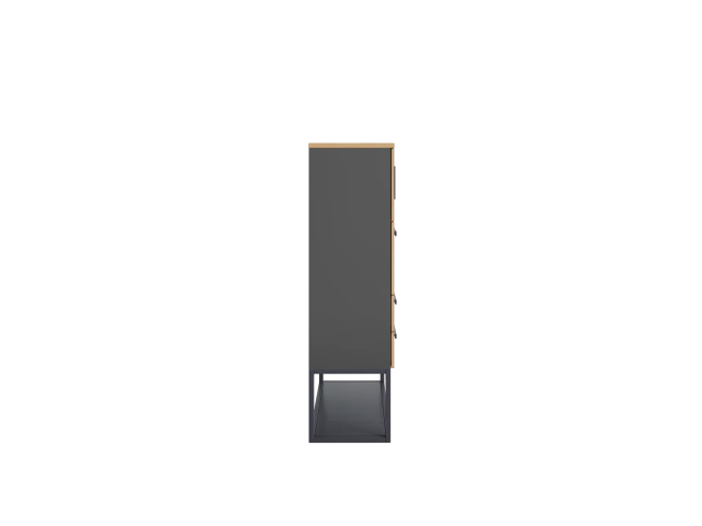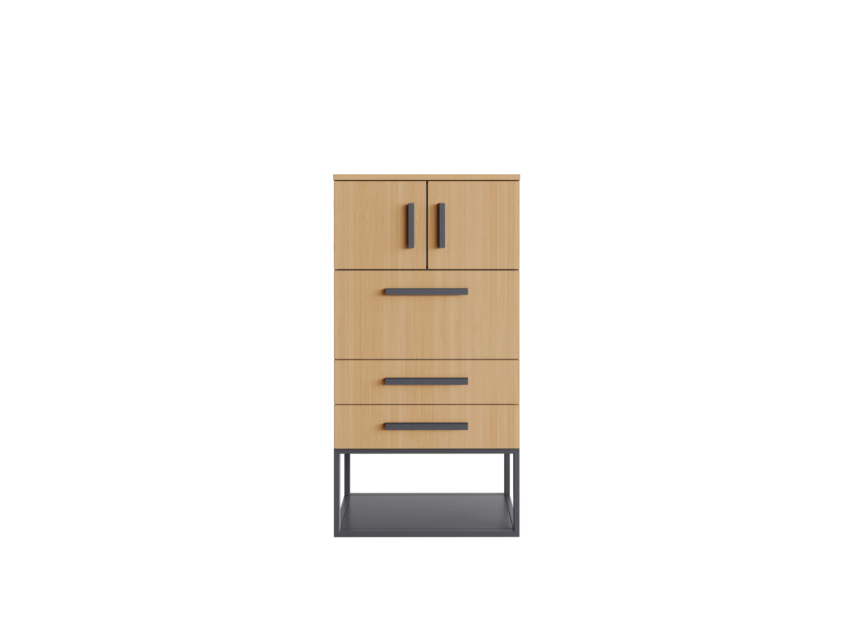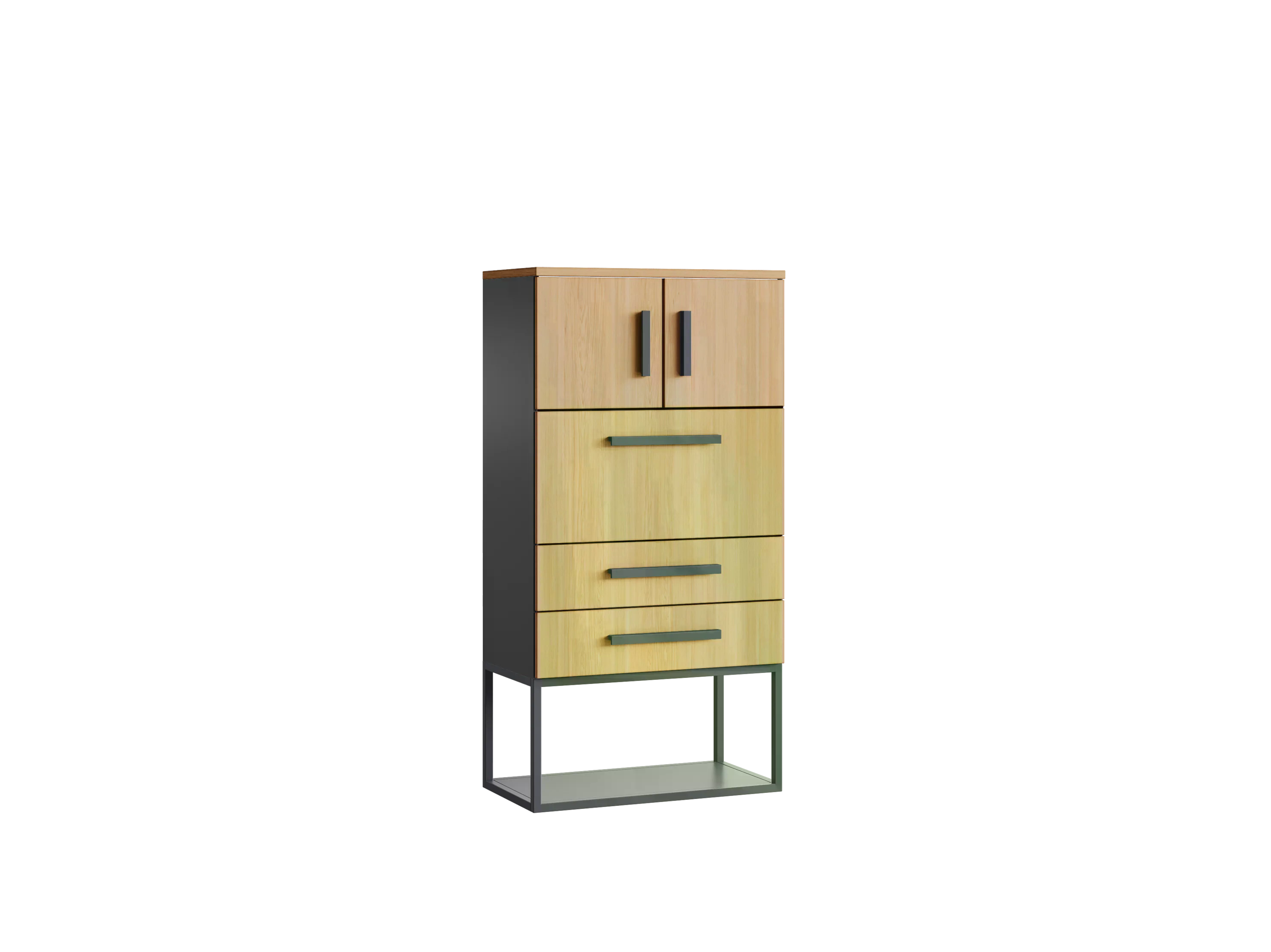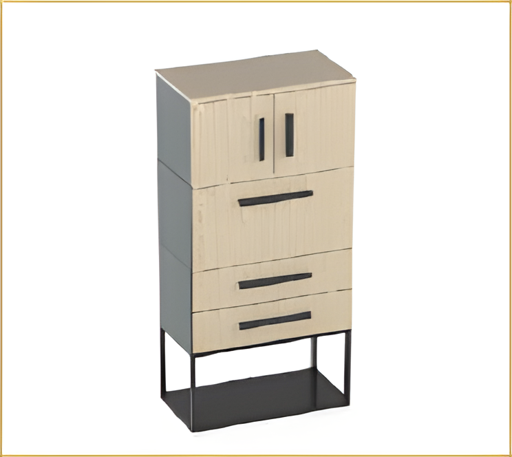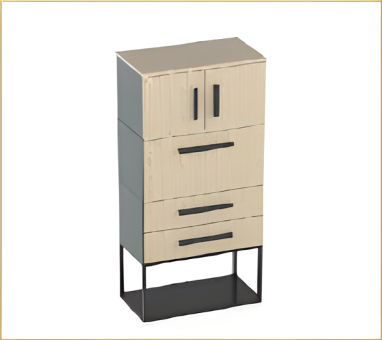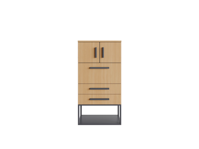 Система хранения с двума ящиками, откидной дверцей и распашными врерьми сверху, снизу рамка. Корпус, двери и фасады ящиков выполнены из ЛДСП толщиной 16 мм, топ из ЛДСП толщиной 25 мм. Корпуса ящиков сварные, металлические. Устанавливается на металлическую рамку с регулируемыми опорами, можно выровнять изделие на неровном полу. Ручки эргономичные, металлические.
