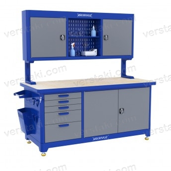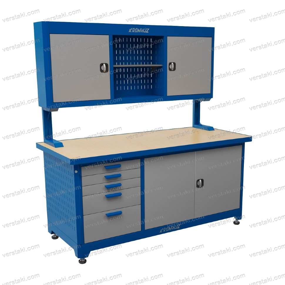 Металлический верстак автомаляра KronVuz TBW 522–7101Р оснащен перфорированным экраном с полкой и закрытыми шкафами для хранения грунтовки, баллончиков краски и прочего инвентаря. Нижние полки верстака, оснащенные дверцами с ригельной системой запирания, позволяют удобно хранить механическое оборудование (компрессор, краскопульт, полировальную машину). Выдвижные ящики стола подойдут для размещения мелкого инструмента.