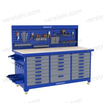 Металлический верстак слесаря KronVuz TBW 868–S1 представляет собой устойчивую конструкцию с большой столешницей и небольшим, но вместительным перфорированным экраном. Боковые стенки верстака оборудованы несколькими полками, рядом крючков под инструменты, навесными стойками под полотенца.