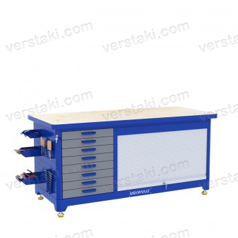 Металлический верстак механика KronVuz TBW 811R2 имеет металлическую столешницу с 12 мм фанерным покрытием. Под столешницей организовано пространство для хранения рабочих инструментов, деталей, расходного материала. Полки для хранения оборудования в TBW 811R2 закрываются роллетой, а тумба с выдвижными ящиками запирается на замок системы «ригель».